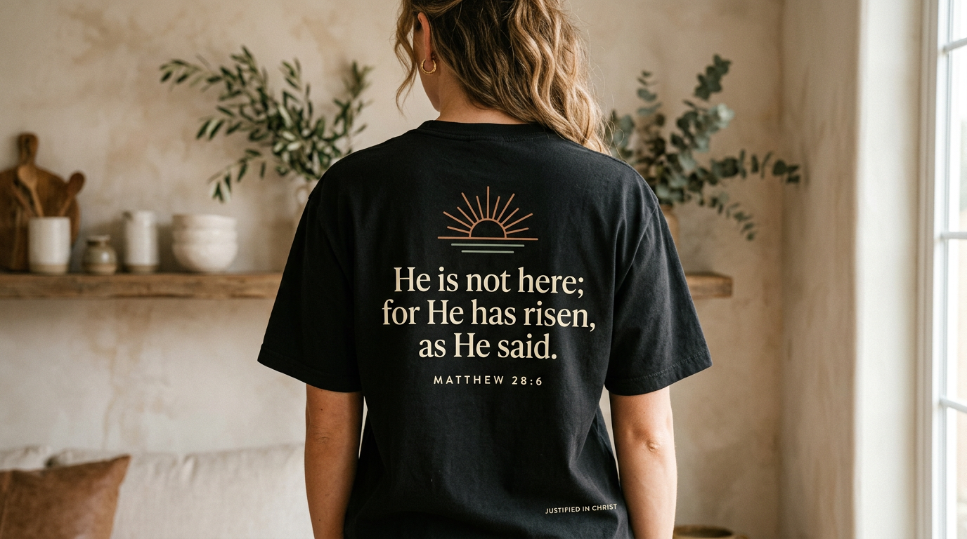 A bold resurrection statement rooted in Matthew 28:6. Clean, elevated, and built to keep Easter truth close in everyday life.